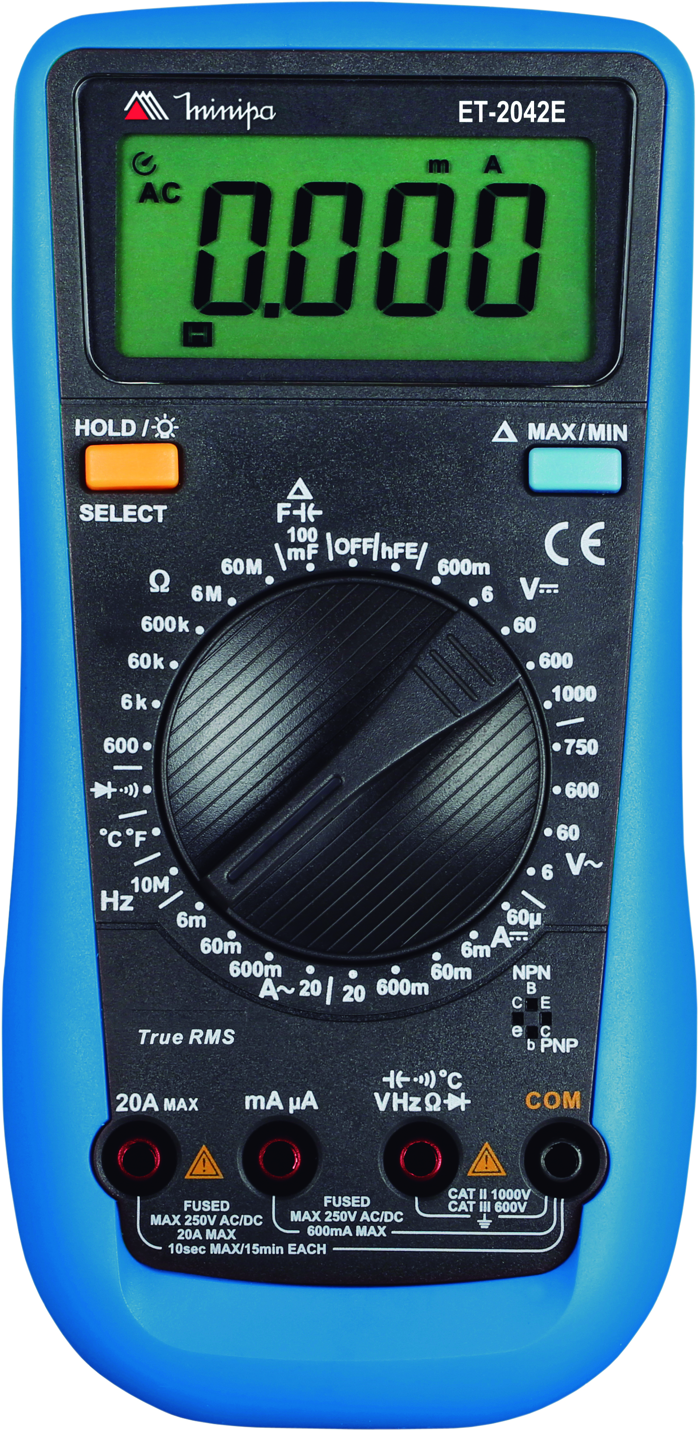 Realiza medidas de tensão AC e DC até 600V (corrente alternada e corrente contínua), corrente AC e DC até 10A, resistência, continuidade, diodo e transistor hFE (ganho estático de corrente).